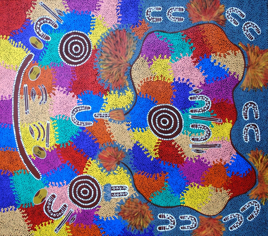 Belinda’s Dreamings include: Two Jangala Men, Native Bush Seeds, Her Home Land, Water Dreaming and Rain Makers.