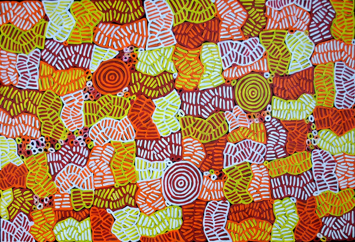 Betty Mbitjana is the daughter of acclaimed artist Minnie Pwerle (deceased) and sister of the artist, Barbara Weir. Betty paints the Body Design, Bush Berry and Bush Plum dreaming. Betty’s mother, Minnie and other women used to collect Bush Berry and Bush Plum, cut them up into pieces, skewer them on a piece of wood and dry them to be eaten in times when bush tucker was scarce.
